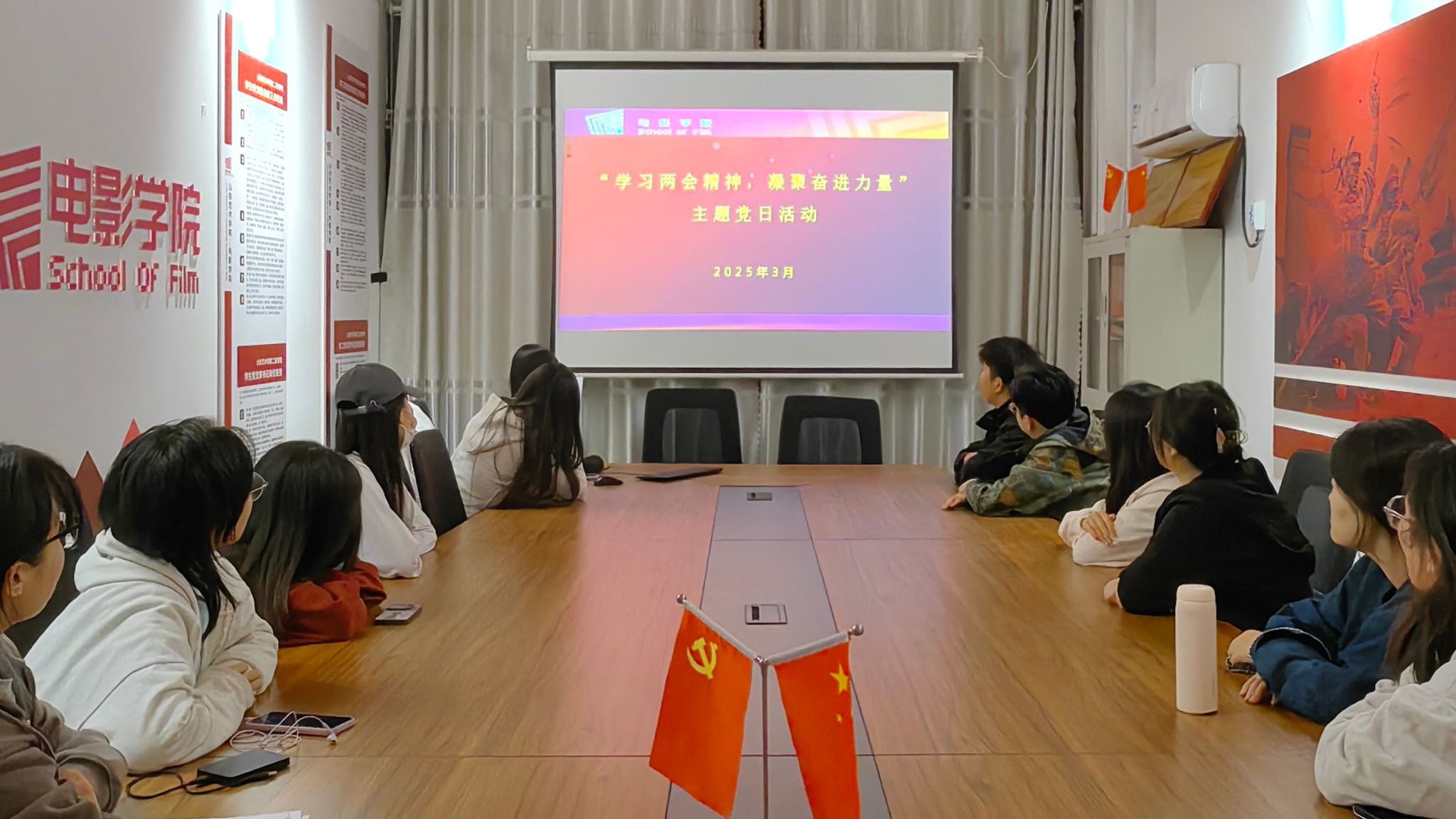 2025年3月24日,电影学院学生党支部在学院会议室举行"学习两会精神,凝聚奋进力量"主题党日活动,通过专题学习、视频观摩、交流研讨等形式,推动全国两会精神落地生根。