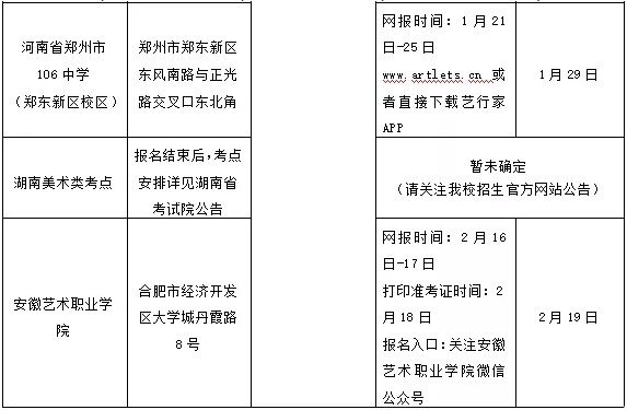 ●我校2019年在湖南、江苏、安徽、河南、浙江、四川、辽宁省设立美术类考点,以上省份的考生只能在本省考点参加校考。对在其他考点参加考试的成绩不予承认。