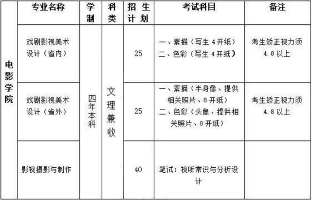按照山东艺术学院2019年招生计划,我院戏剧影视美术设计专业面向全国招生50人,山东省内招25人,省外25人(凡符合各省(自治区、直辖市)规定的2019年普通高等学校招生报名条件者,均可报考)。影视摄影与制作专业面向山东省招收40人。