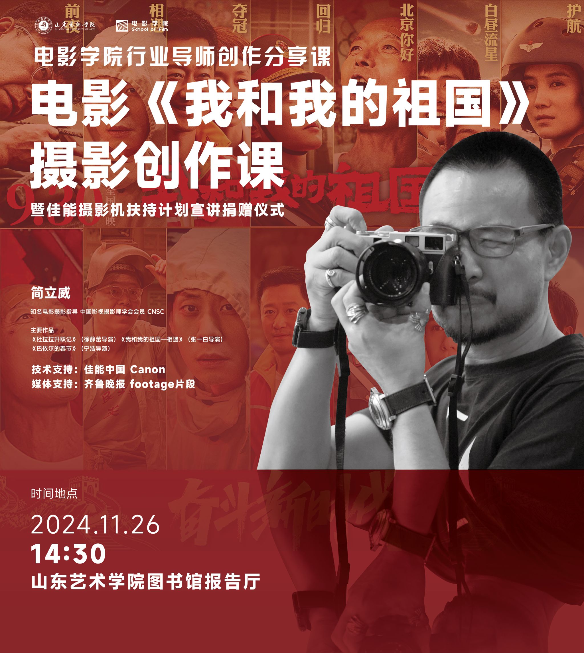 11月26日,山东艺术学院电影学院将再次迎来重要活动——“电影《我和我的祖国》摄影创作课”暨佳能摄影机扶持计划宣讲捐赠仪式。