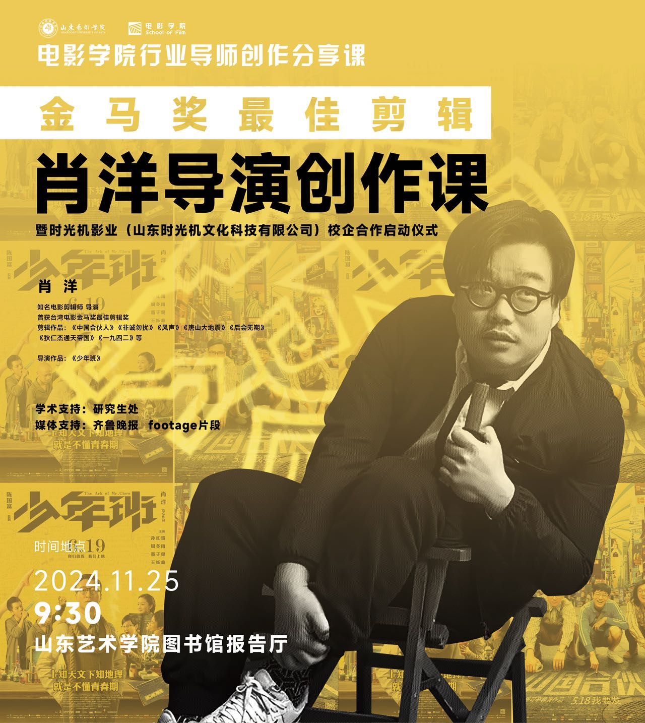 山东艺术学院电影学院将再次携手行业,为学子们带来专业创作课程,提供行业指导。2024年11月25日,在山东艺术学院图书馆报告厅,将举办“肖洋导演创作课”讲座暨电影学院与时光机影业(山东时光机文化科技有限公司)校企合作启动仪式。