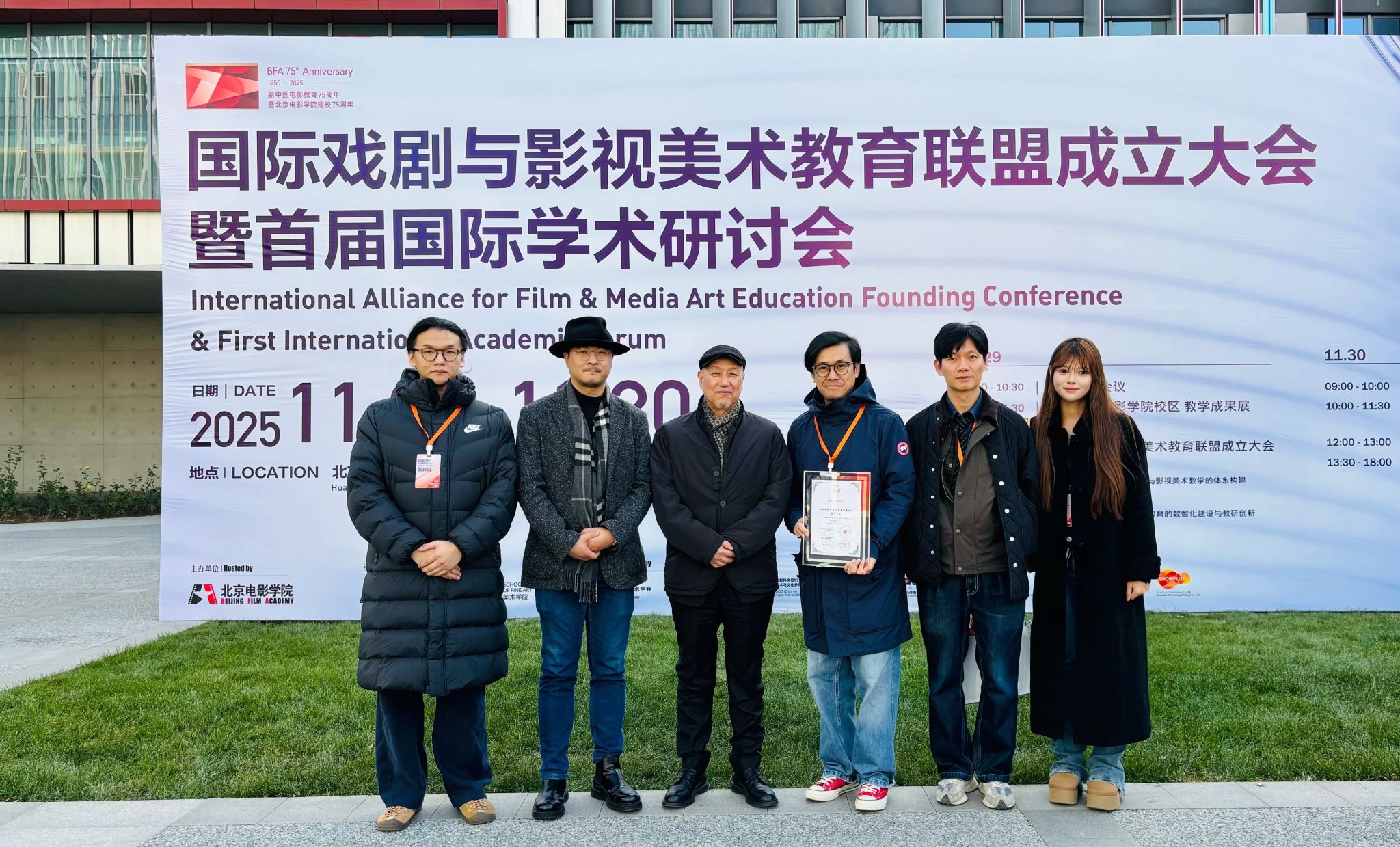 11月29日、30日,由北京电影学院主办,中国电影美术学会和联合国教科文组织电影艺术与文化多样性教席指导,以 “创新・传承・协同” 为主题的中国电影 “国际戏剧与影视美术教育联盟”成立大会暨首届国际学术研讨会正式举行,来自国内外的多所艺术院校、行业组织及产业界代表共同见证了这一国际化艺术教育平台的落地。北京电影学院党委书记周志军、原副院长王鸿海、中国电影美术学会会长霍廷霄、北京市怀柔区委宣传部常务副部长于德利,以及来自国内外52所艺术类高校的院长、学科带头人、一线美术师与产业代表出席了本次盛会,电影学院获任联盟理事单位,学院副院长孙非、舞台美术系系主任王书成、创研中心主任曲光复以及相关专业研究生参加了联盟成立及论坛活动。