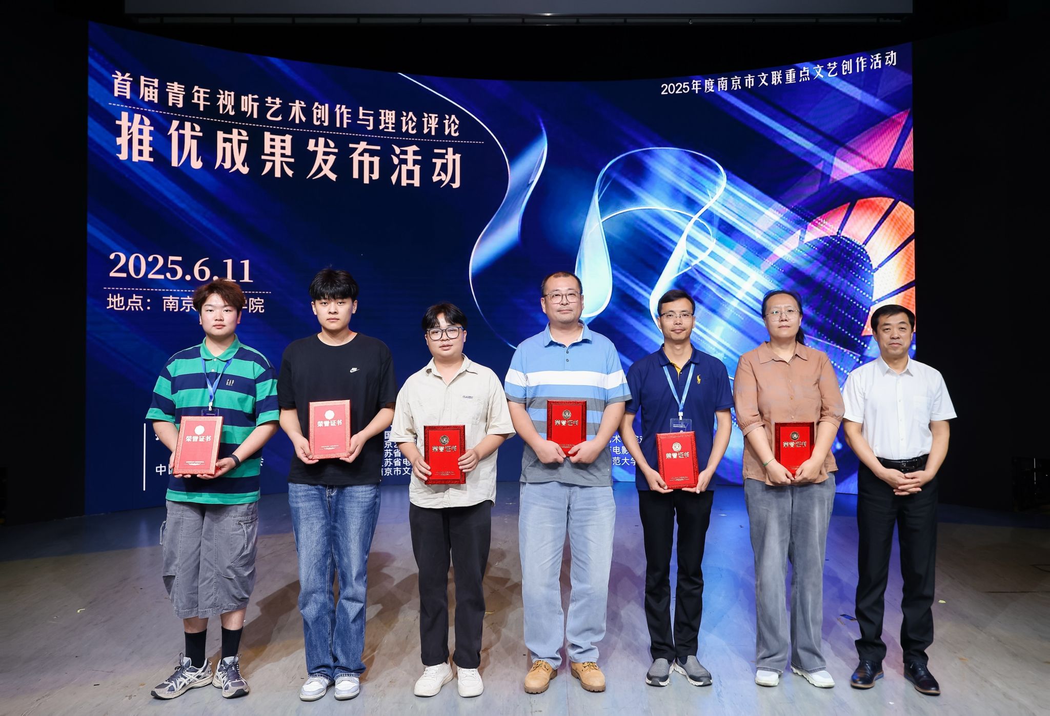 6月11日,由中国电视艺术家协会指导,中视协高等院校视听艺术委员会、南京艺术学院、江苏省电视艺术家协会、江苏省电影家协会、南京市文学艺术界联合会联合主办,首届青年视听艺术创作与理论评论文章推优活动颁奖典礼在南京艺术学院举行,电影学院选送的纪录片作品《贾樟柯的平遥》荣获学生单元优秀作品奖,电影学院与摩曦映画联合摄制纪录片《山上有座纪念塔》、电影艺术创作方向研究生刘超、杨若希创作的AIGC短片《一方砚台寄相思》、22级影视摄影与制作专业本科生朱梦阳、王彤彤、王志鹏的短片《空白地平线》入围教师组及学生组优秀作品。