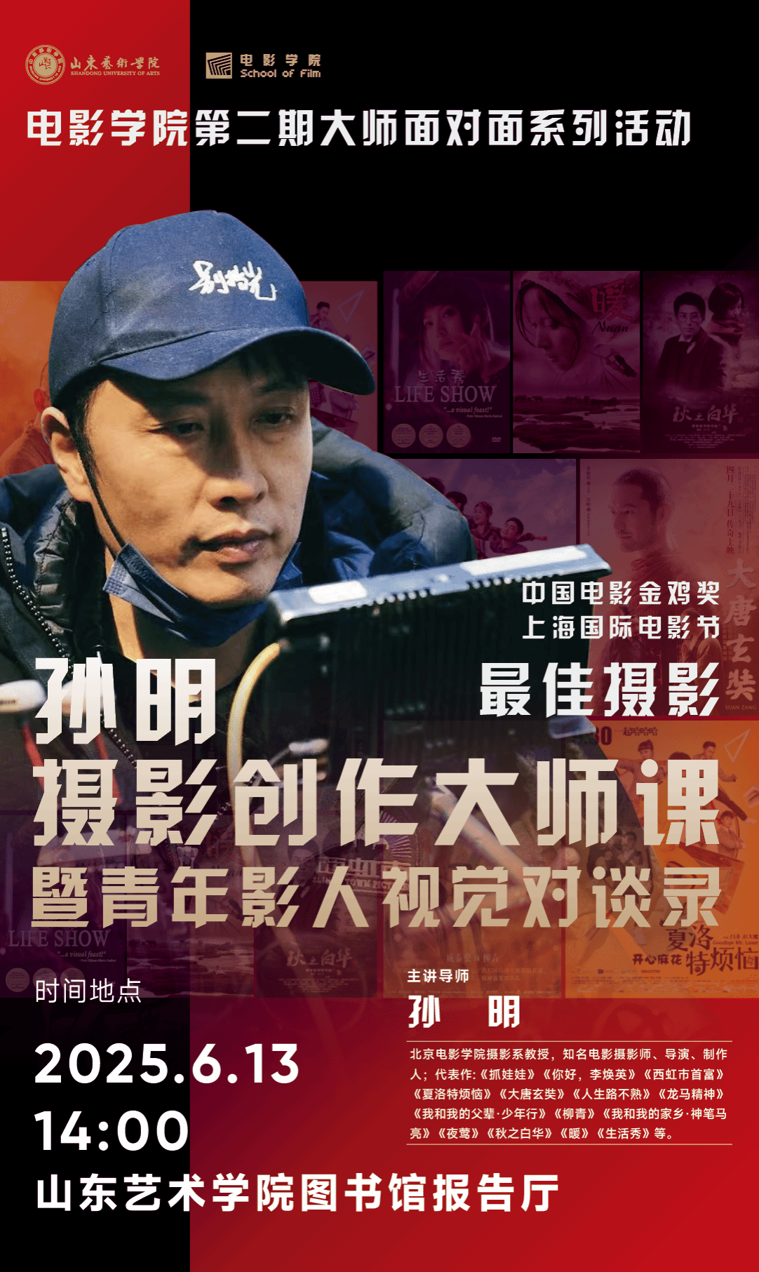 活动期间,电影学院的学生代表也将与孙明老师一起,围绕电影的视觉创作展开一场深度对话。我们期待与您共同见证,那些曾被镜头定格的晨昏,如何在思想的交汇中显现锋芒。