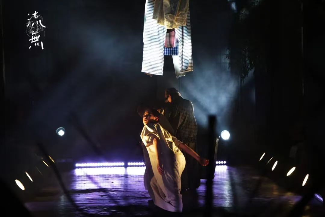 环形演区与“洗衣工循环动作”形成象征性统一,通过物理空间放大戏剧内核。本剧利用建筑空间设置多场景环绕式布局,演员穿行于观众席间,使观众从“旁观者”变为“参与者”,强化了情绪的沉浸式传递。观众被裹挟在不同演区之间,最终在衣物飘落的场景中成为“共谋者”,亲历一个女人“尘埃散尽”后的净化仪式。最后利用建筑二层飘落衣物的设计,突破了平面舞台的局限,垂直空间被进一步利用。
