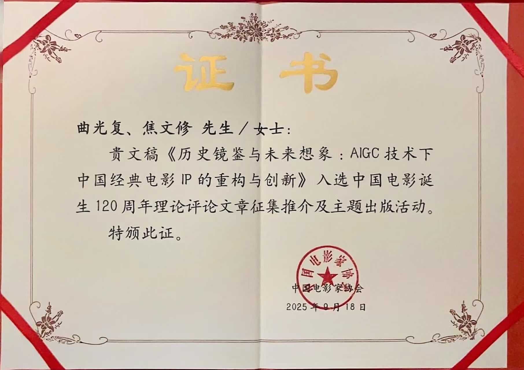 电影学院青年教师曲光复的理论评论作品《历史镜鉴与未来想象:AIGC 技术下中国经典电影 IP 的重构与创新》成功入选中国电影家协会主办的“ 中国电影诞生 120 周年理论评论文章征集推介 ”活动。文章在中国电影诞生 120 周年的历史节点上,探讨了 AIGC 技术对中国经典电影 IP 的重构与创新这一前沿课题。