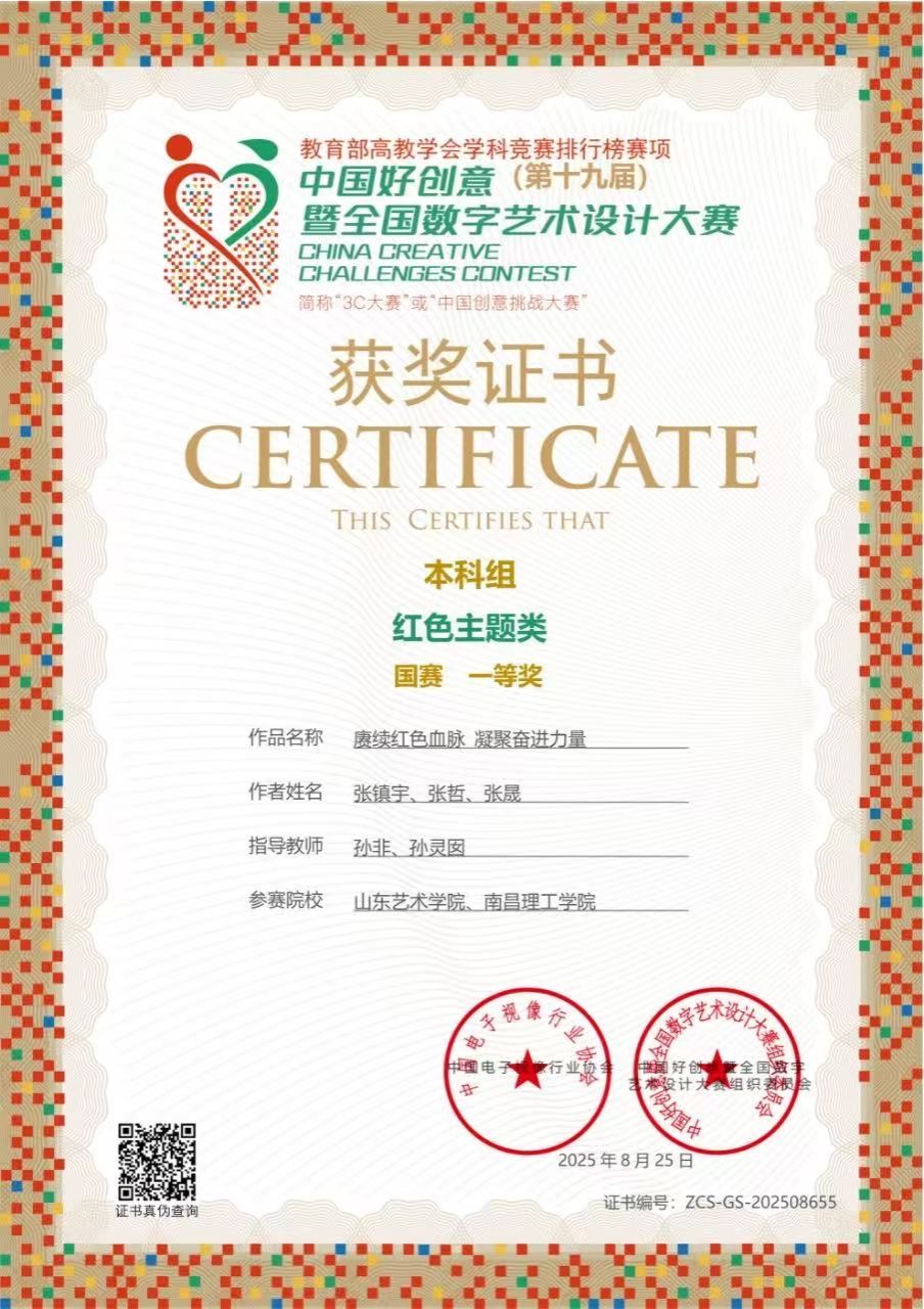电影学院电影艺术创作研究生张哲的作品《赓续红色血脉 凝聚奋进力量》在上万件作品中脱颖而出,荣获第十九届中国好创意暨全国数字艺术设计大赛国赛一等奖。